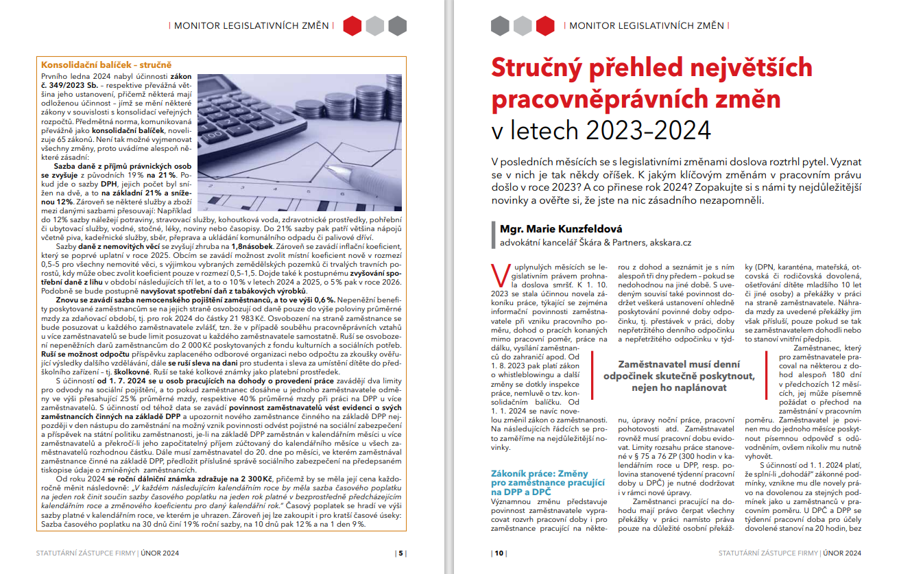Monitor legislativních změn: přijatá legislativa zásadně ovlivňující řízení firmy; informace o chystaných změnách včetně analýz dopadu těchto změn do praxe